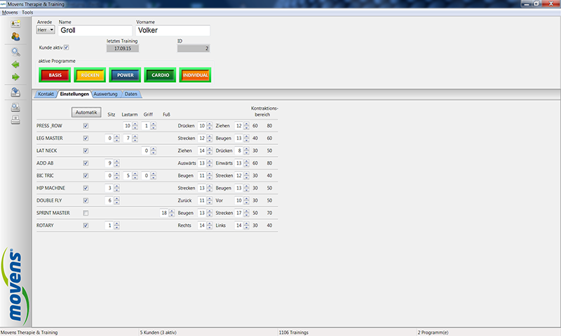 Alle Movens Chipkarten Geräte funktionieren mit einer Software-Steuerung. Die Software vereinfacht die Bedienung der Geräte und unterstützt den Therapeuten oder Trainer während der Einweisung und im Training.