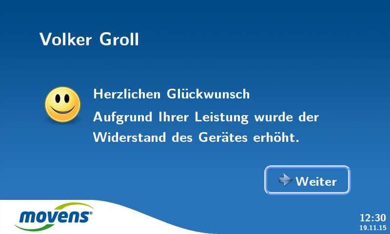 Die Software zeigt am Touch-Screen die Geräteeinstellungen an und unterstützt dabei die richtige Ausführung während des Trainings. Der Trainierende erhält während des gesamten Trainings den Hinweis, ob er die Bewegung korrekt ausführt und wird durch die Leistungsanzeige gleichzeitig motiviert, ein intensiveres Training durchzuführen. Hierdurch kann er einen besseren und schnelleren sichtbaren Trainingserfolg erreichen.