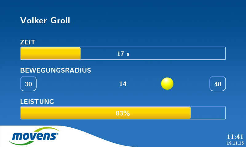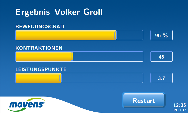 In den von dem Therapeuten oder Trainer bestimmten Intervallen können die Trainingsdaten in der Trainersoftware MoveIT ausgewertet werden. Damit ist eine einfache Auswertung garantiert. Trainingsfehler werden frühzeitig festgestellt und die Leistungsentwicklung und der Trainingserfolg wird einfach und übersichtlich dargestellt. Mit den Ergebnissen ist der Therapeut oder Trainer immer informiert und kann jederzeit ein Beratungsgespräch mit dem Trainierenden durchführen.